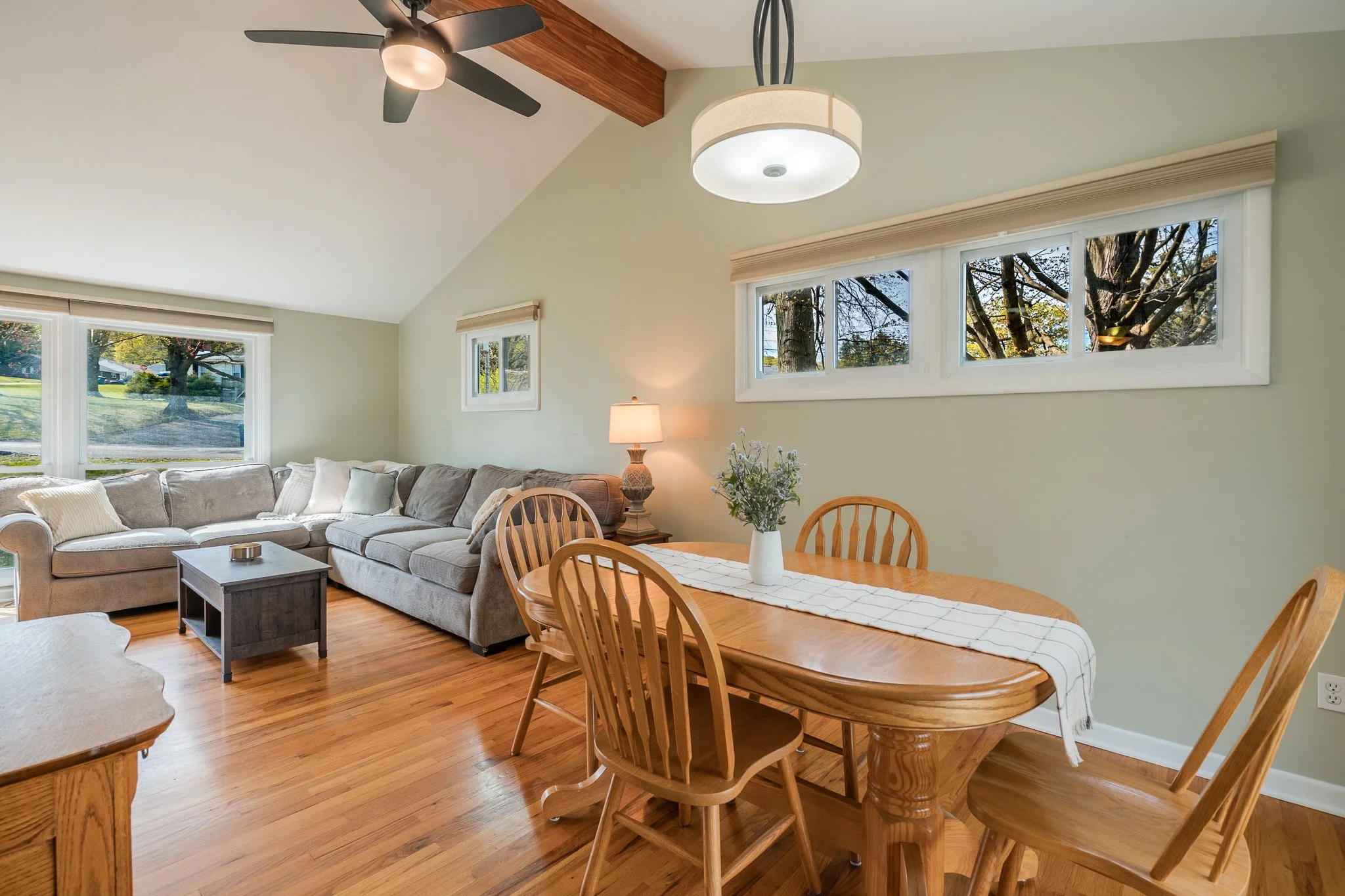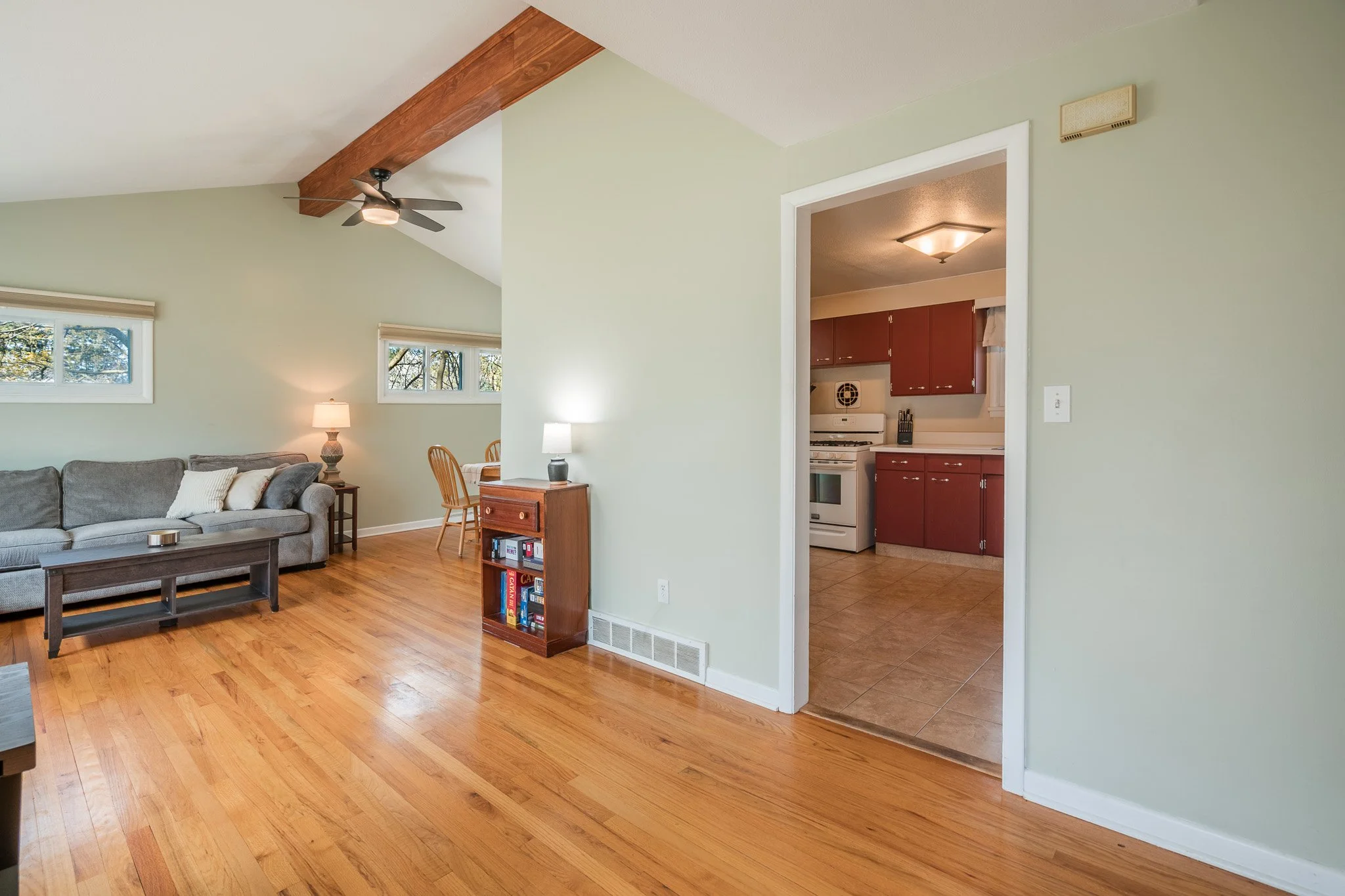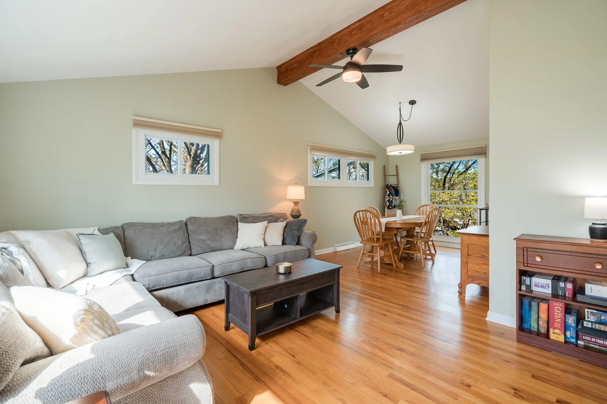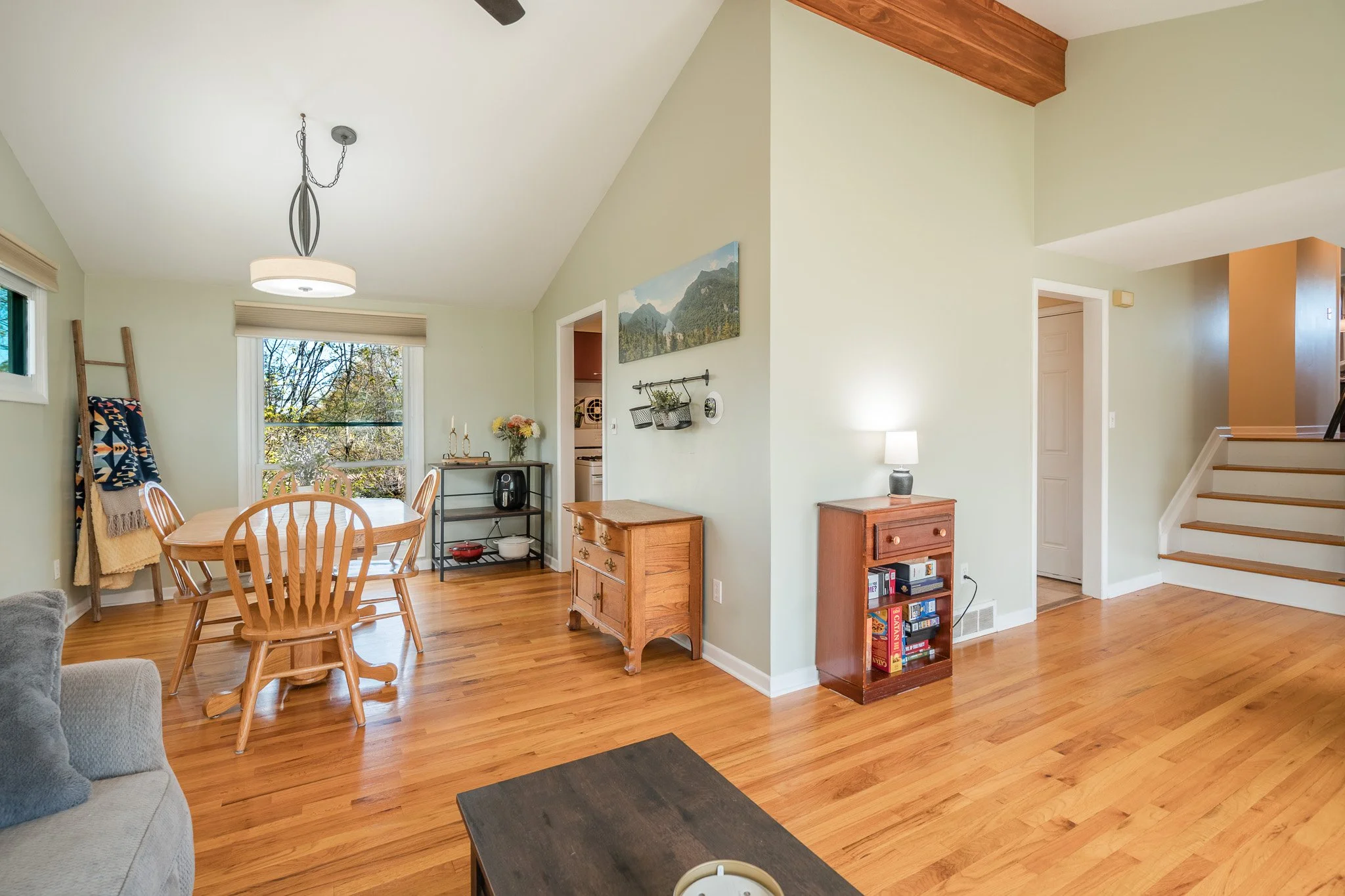 Inside, natural light pours through oversized windows, highlighting the beautiful hardwood floors and drawing your eye up to the vaulted ceilings and stunning exposed beam that anchor the main living space. The layout feels both open and comfortable, offering a natural flow for everyday living.