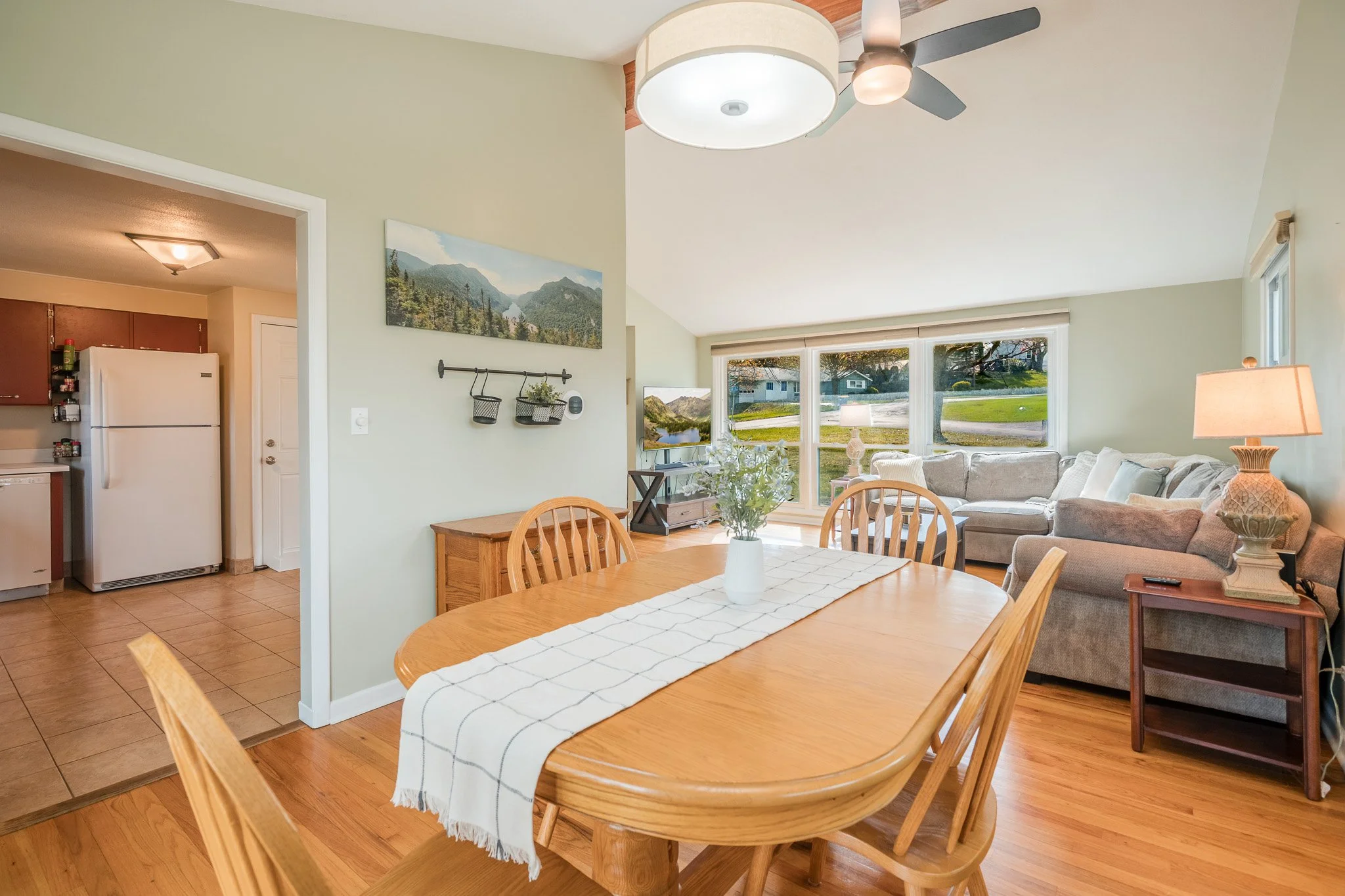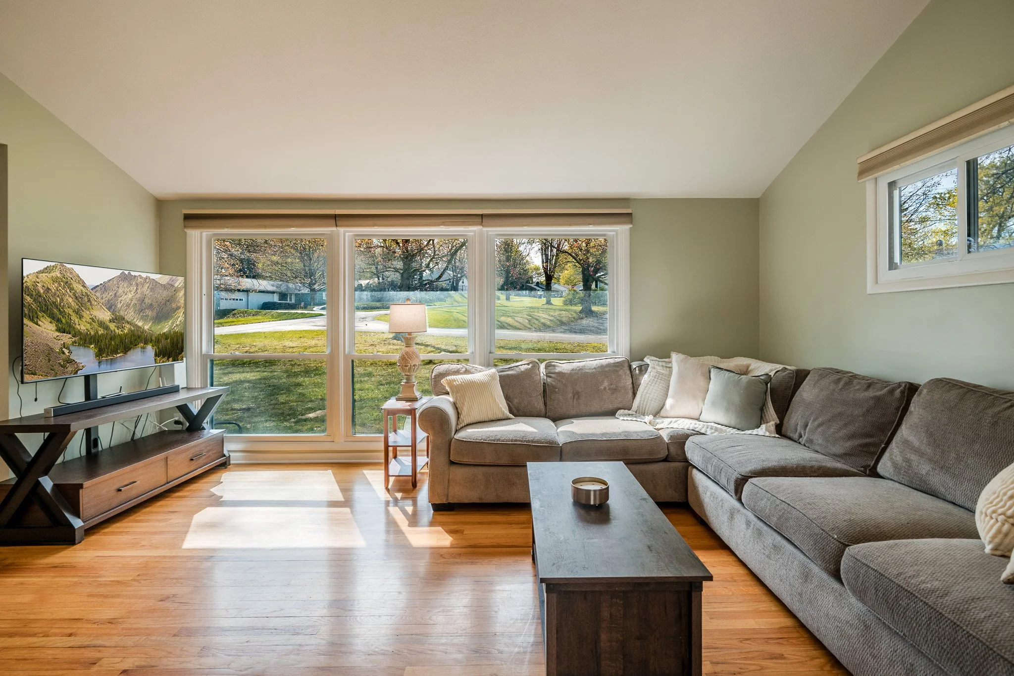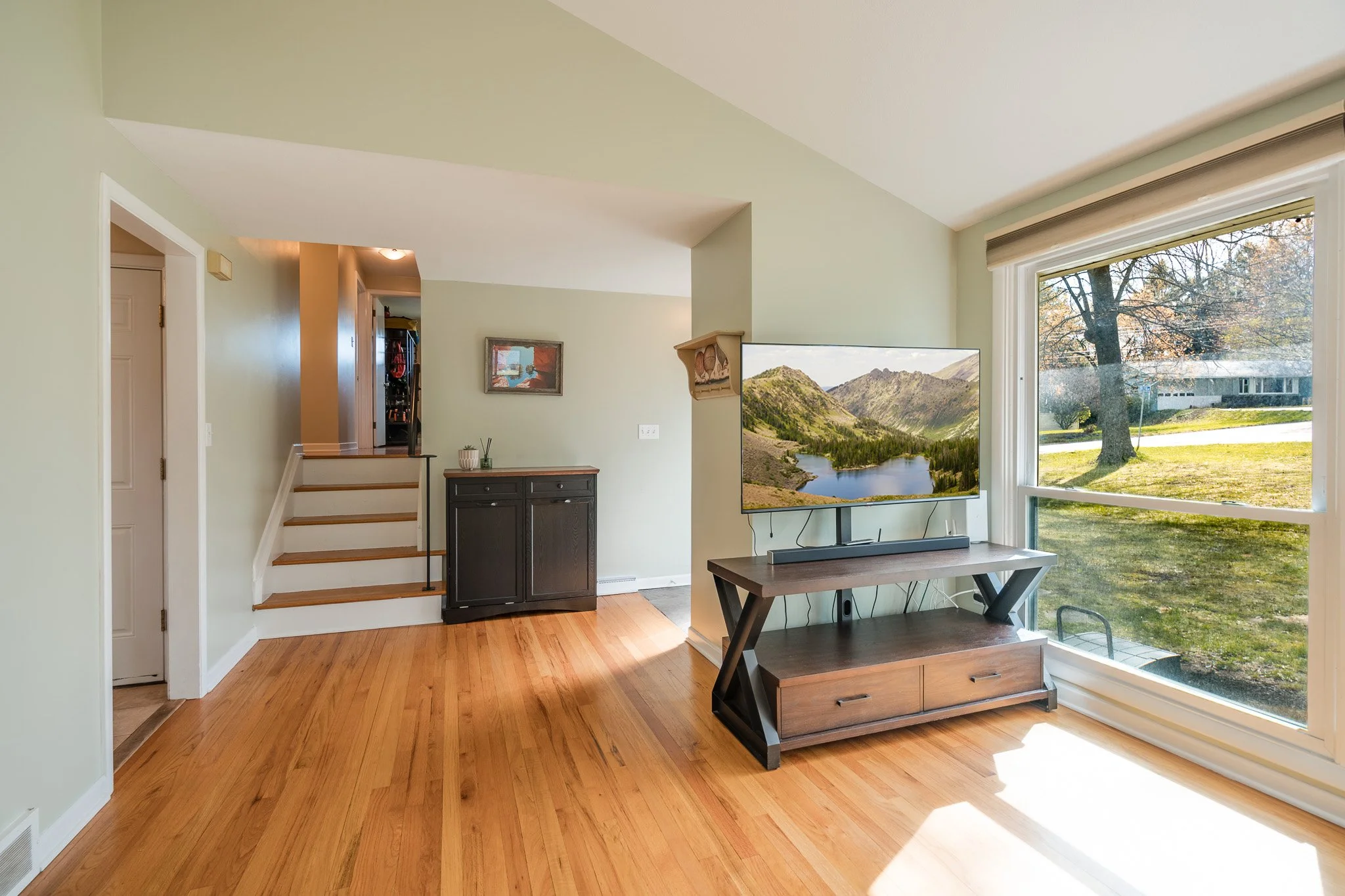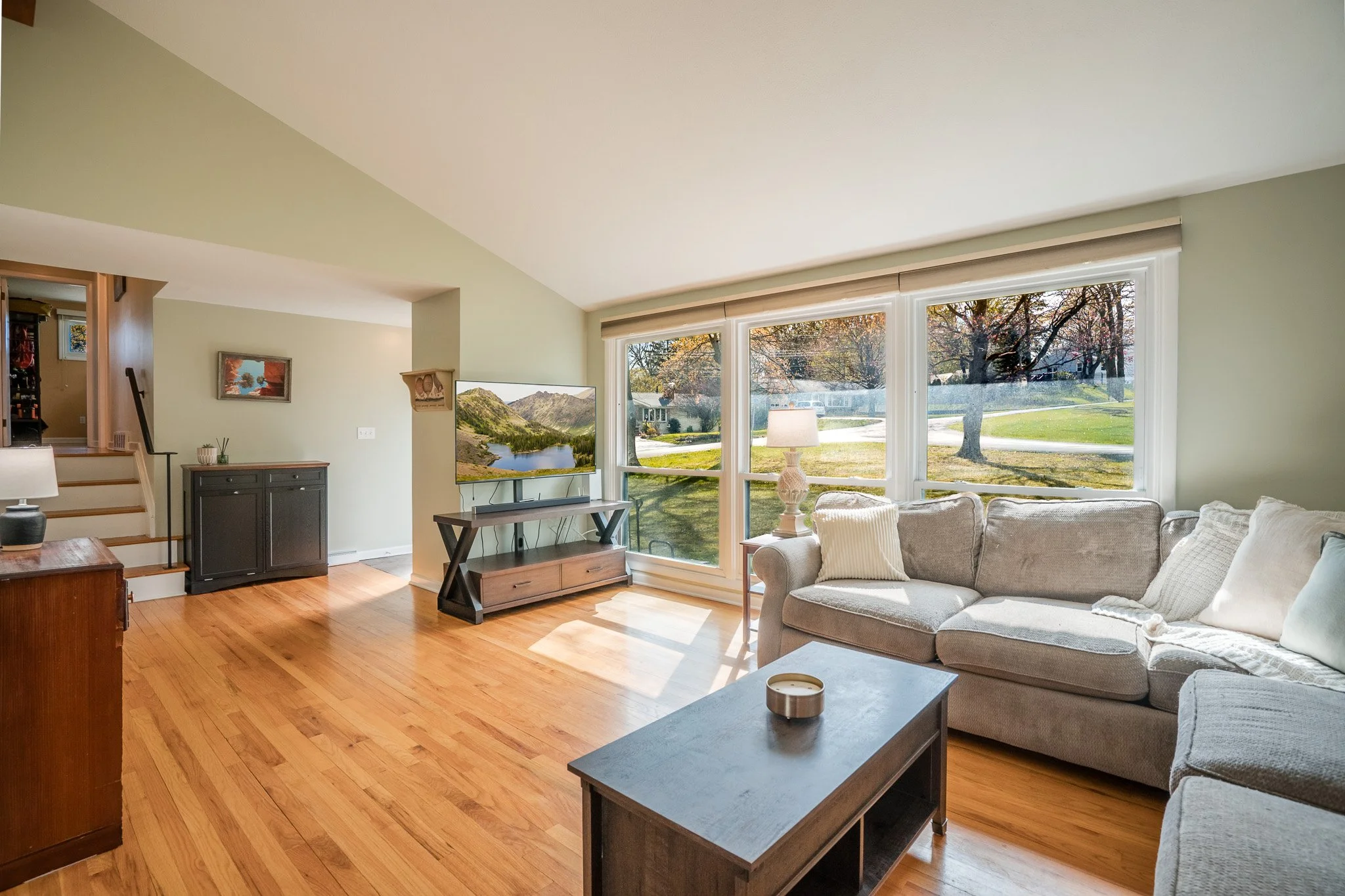 Inside, natural light pours through oversized windows, highlighting the beautiful hardwood floors and drawing your eye up to the vaulted ceilings and stunning exposed beam that anchor the main living space. The layout feels both open and comfortable, offering a natural flow for everyday living.